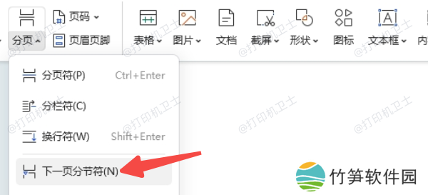 2、点击菜单栏“布局”>“分隔符”,选择“下一页”分节符。