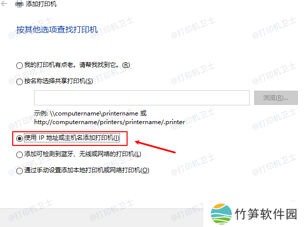 3、如果系统未自动发现设备,点击“我需要的打印机不在列表中”;4、选择“使用IP地址或主机名添加打印机”(适用于无线打印机),或“使用已有端口”添加;
