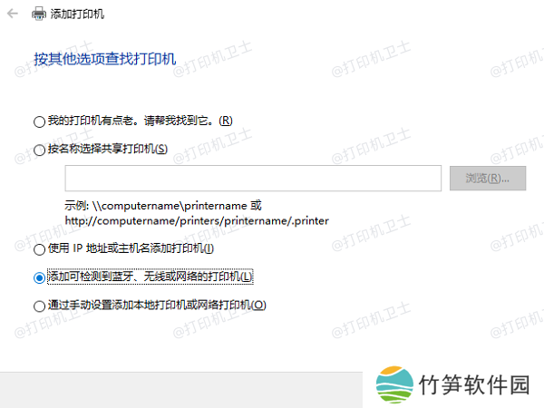 3. 等待搜索完成或手动添加:如果系统能识别到共享的打印机,它将出现在列表中。点击对应打印机并根据提示完成安装即可。如果没有自动显示,可选择底部的“我所需的打印机未列出”。