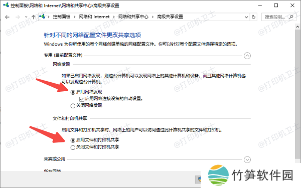 2、在“专用”网络和“所有网络”中都勾选“启用文件和打印机共享”。