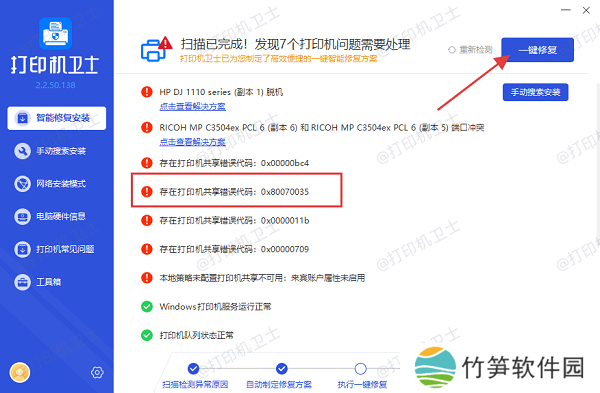 3、如果发现“存在打印机共享连接异常,错误代码:0x80070035”,直接点击右上角的“一键修复”按钮。
