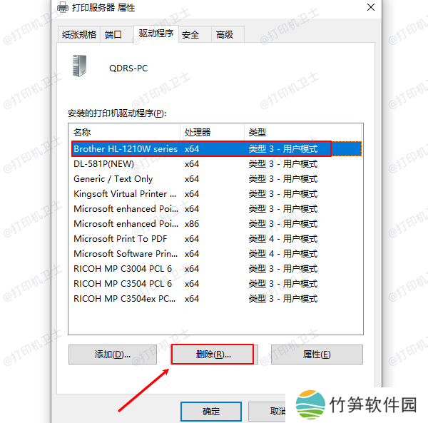 4、选择对应的打印机驱动,点击“删除”;5、断开打印机连接(如果是网络打印机则重启路由器);6、通过“本站”快速扫描型号匹配驱动进行安装。示例如下: