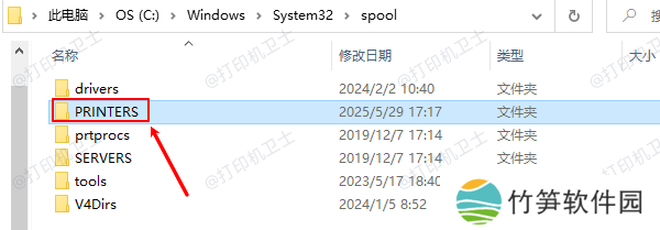 如果服务重启无效,可以手动清除打印任务缓存,避免系统一直尝试处理损坏的打印任务。操作步骤如下:1、停止“Print Spooler”服务(参考上一步);2、打开以下路径:C:WindowsSystem32spoolPRINTERS;