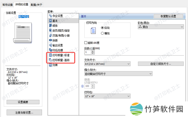 有时候,驱动程序出错或设置不当也会影响打印质量。例如驱动设置为“草稿模式”会降低墨水使用量,从而导致打印图像变浅甚至出现空白条纹。