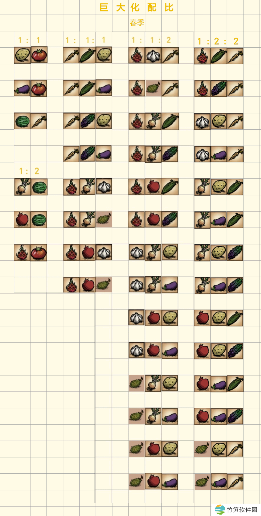 按照下图配比种植,在正确的季节,只需要对话和浇水即可种植出巨大化作物。